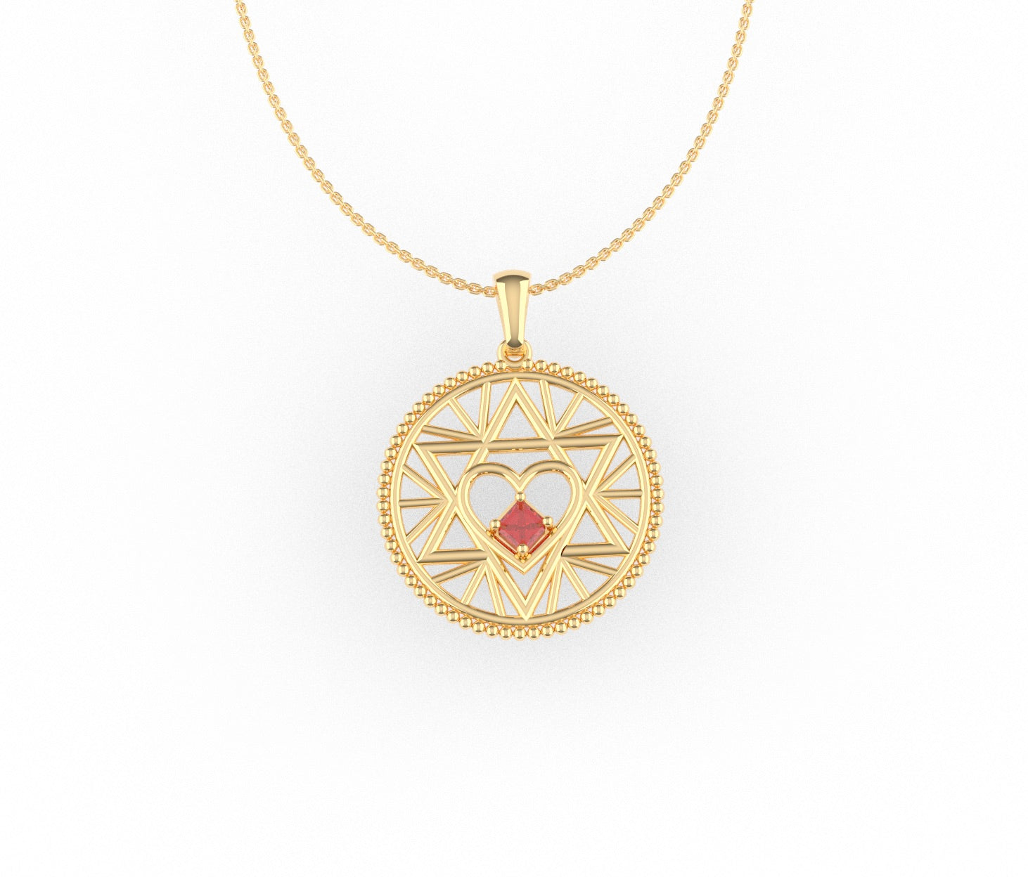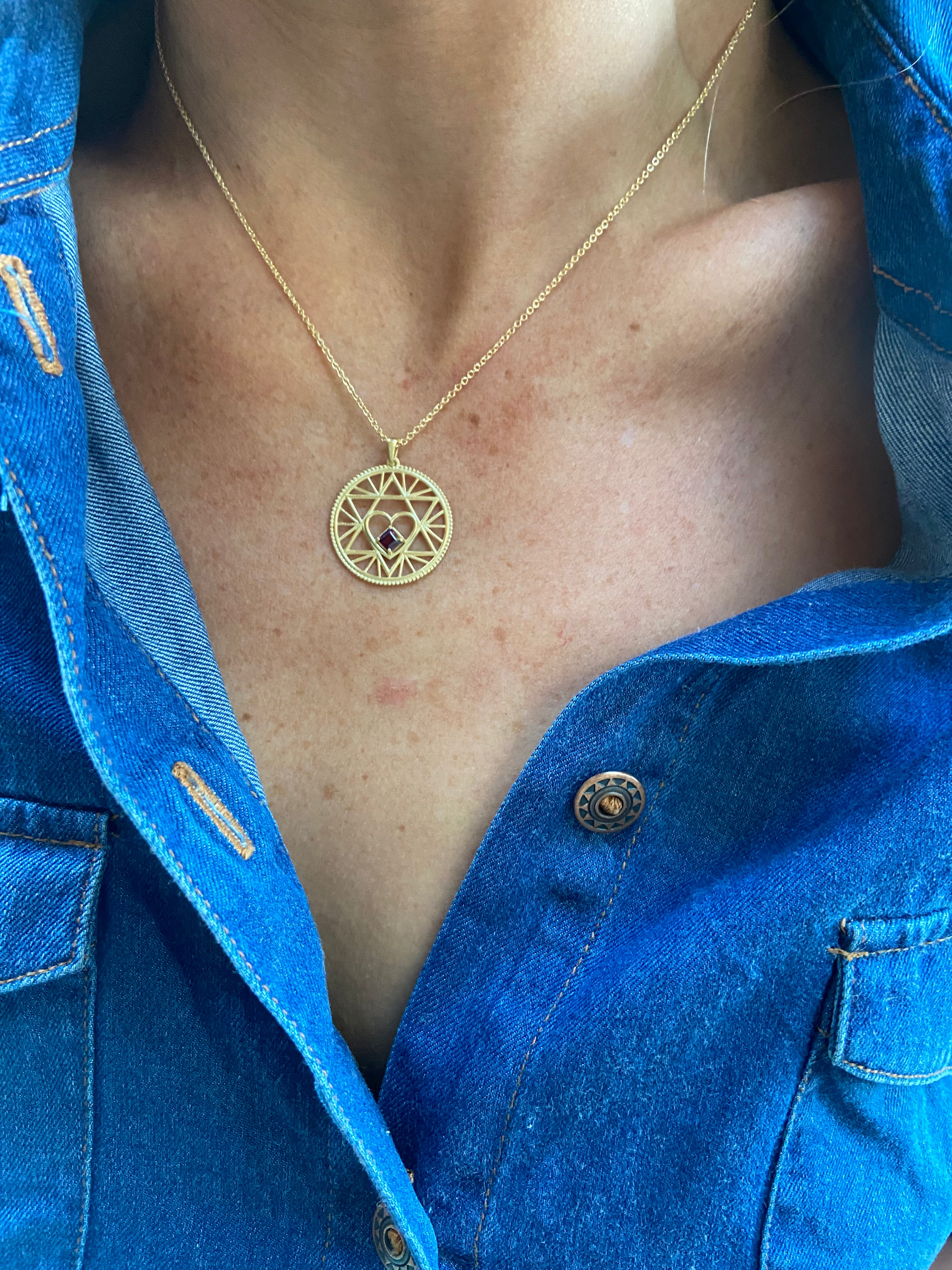 שרשרת יוקרתית בעבודת יד עשויה זהב 14 קראט, בעיצוב מגן דוד פתוח ועדין המשלב קווים גאומטריים נקיים עם לב מוזהב במרכז. בתוך הלב משובצת אבן גרנט טבעית בגוון אדום עמוק, המוסיפה נגיעה חמה, אלגנטית ומלאת משמעות.