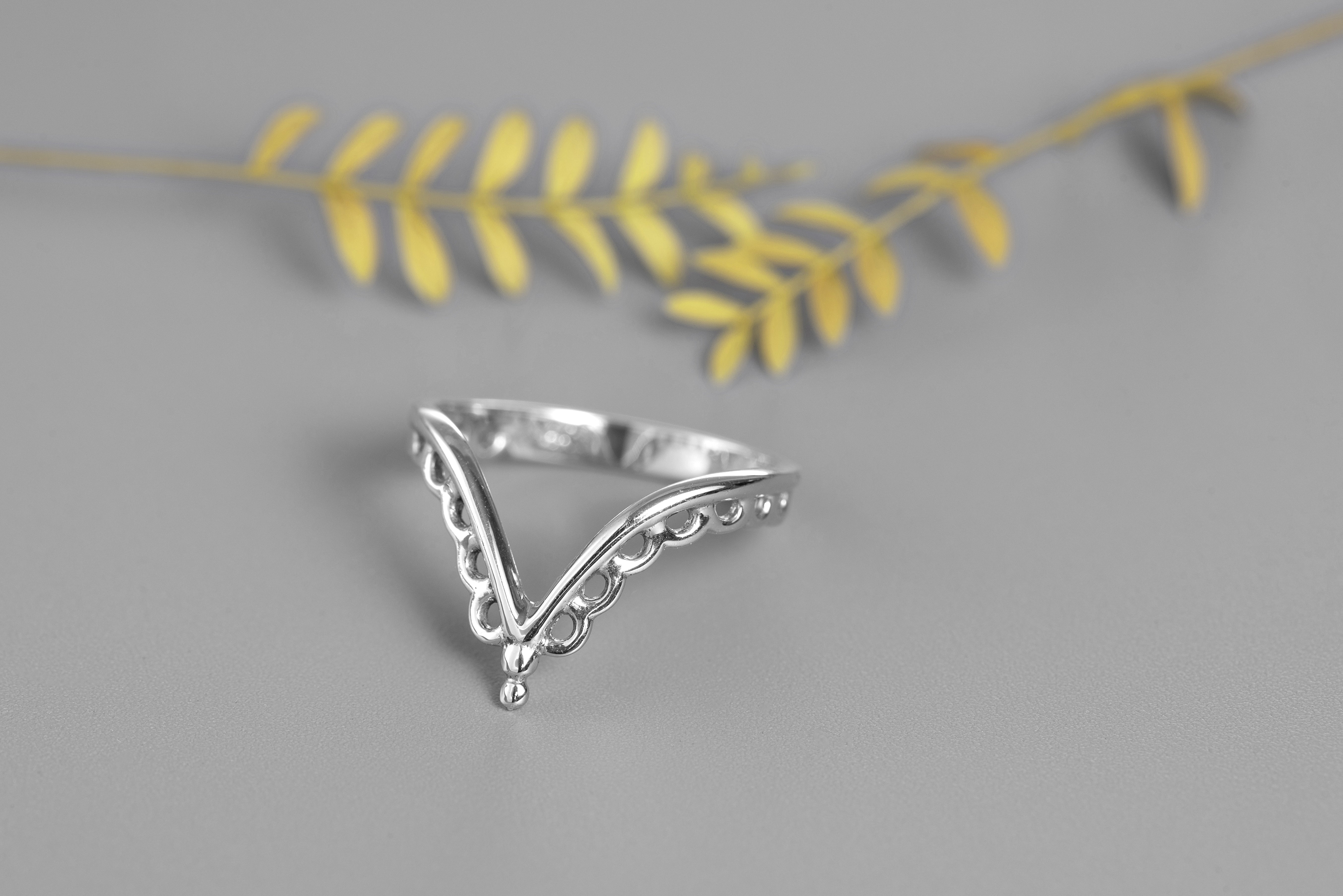 טבעת כסף אתנית ייחודית בעבודת יד בצורת וי, כמו קישוט יפהפה על היד, עדינה אבל מלאת נוכחות.